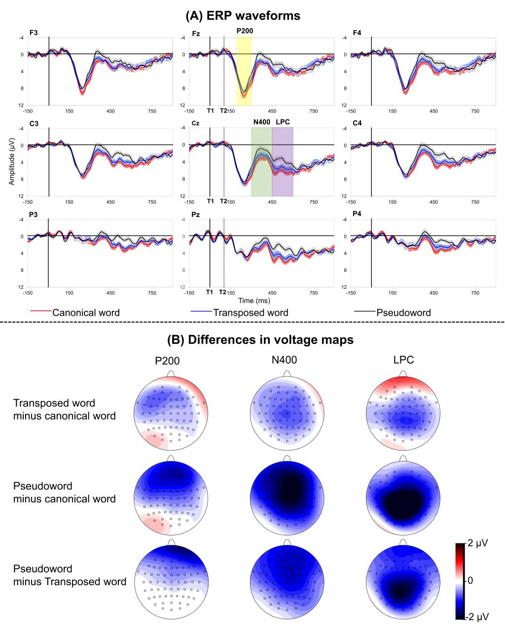 语言认知及语言应用研究基地曹洪文团队研究论文“An ERP investigation of morpheme transposition in rapid serial visual presentation”。该研究采用事件相关电位技术(event-related potential,ERP)和双任务快速序列视觉呈现范式(dual-target rapid serial visual presentation task,RSVP)考察中文复合词词素转换的认知神经机制(如图1所示)。研究发现:词素转换影响中文复合词语义提取和整合过程,表现为更大的N400波幅和更小的LPC波幅(如图2所示)。
