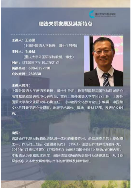 德语系生奉献了题为《德法关系发展及其新特点》的学术讲座。主讲人王志强教授系是教育部国际司国别与区域研究培育基地欧盟研究中心研究员,曾任上海外国语大学学科办主任,上海外国语大学跨文化研究中心副主任,《中德跨文化教育论坛》编辑,中国跨文化日耳曼研究会理事。出版学术著作、词典、教材12部,发表论文64篇。