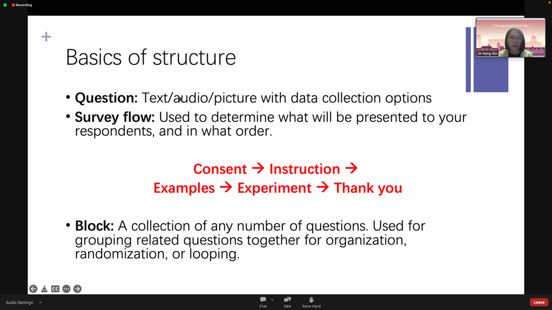 近年受疫情影响,在线实验工具广受热议,康鑫教授已有超过十年的使用经验,她以近期发表的研究成果和正在进行的研究项目为例,分享在线研究工具在语言数据收集和处理的实际应用及其特点,重点讲解Qualtrics、Gorilla和腾讯会议三款工具。讲座伊始,康鑫教授从Qualtrics用户界面开始,讲解研究常用的反应计时、屏幕强制停留等功能,分享了搭配使用编程语言进行媒体文件预加载和干扰信息隐藏处理等小技巧。她讲述了与荷兰鹿特丹大学的Rolf Zwaan教授、香港中文大学黄俊文教授等合作者使用Qualtrics和MTurk采集成年人语言加工数据的经验。康鑫教授也分享了18漫画