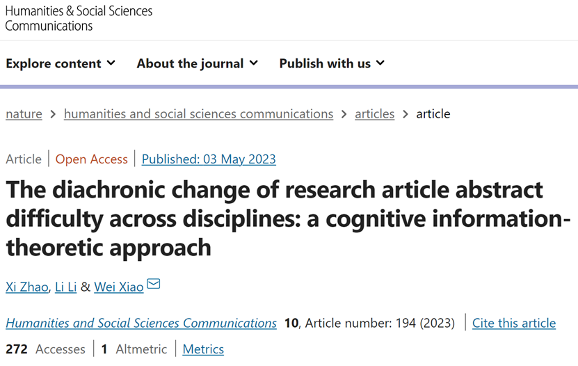 Zhao, X., Li, L. &Xiao, W.*(2023). The diachronic change of research article abstract difficulty across disciplines: A cognitive information-theoretic approach.Humanities & Social Sciences Communications, 10, 194. [SSCI二区, AHCI]