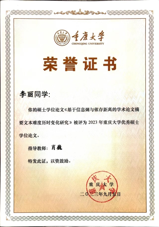 李丽同学的硕士学位论文题为《基于信息熵与依存距离的学术论文摘要文本难度历时变化研究》。该论文以Web of Science抽取的2000-2020年间1890篇学术论文摘要为语料,以信息科学中的信息熵和认知科学中的依存距离为测量指标,探测了学术论文摘要文本编码难度和解码难度的历时变化,以及文本难度历时变化在人文学科、社会科学和自然科学之间的学科差异。该论文的部分前期成果已发表于Journal of Quantitative Linguistics(SSCI二区)和Humanities & Social Sciences Communications(SSCI一区)等期刊,并于第十二届国际语料库语言学大会(CILC 2021)和第七届全国外语教学与研究中青年学者论坛宣读。
