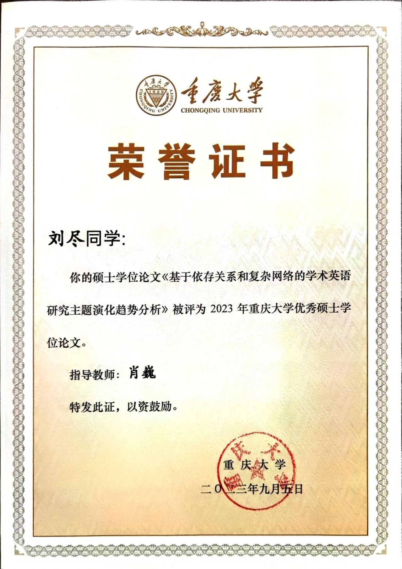 肖巍教授指导的2022届硕士生李丽和刘尽获评优秀硕士学位论文奖。