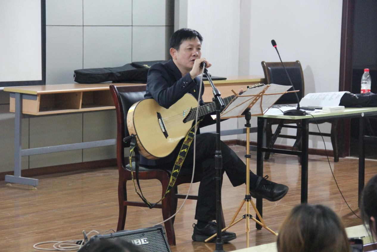 的教师和同学们热情高歌了众多经典英文歌曲。在谈及美国歌手唐·麦克莱恩为荷兰著名印象派画家文森特·梵高所创作的歌曲《Vincent》时,段教授引述古希腊西蒙尼·特斯的名言:“画是无言诗,诗是无言画”,让全场为之倾倒。而中英文版本的歌曲《传奇》的合唱,也将现场氛围推向了高潮。随着最终一曲吉他弹唱缓缓结束,这场英文歌曲盛典讲座也圆满落幕。