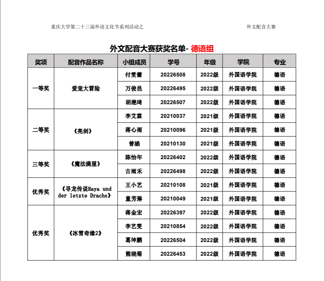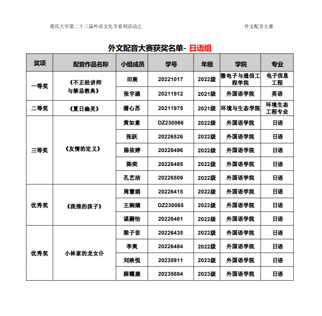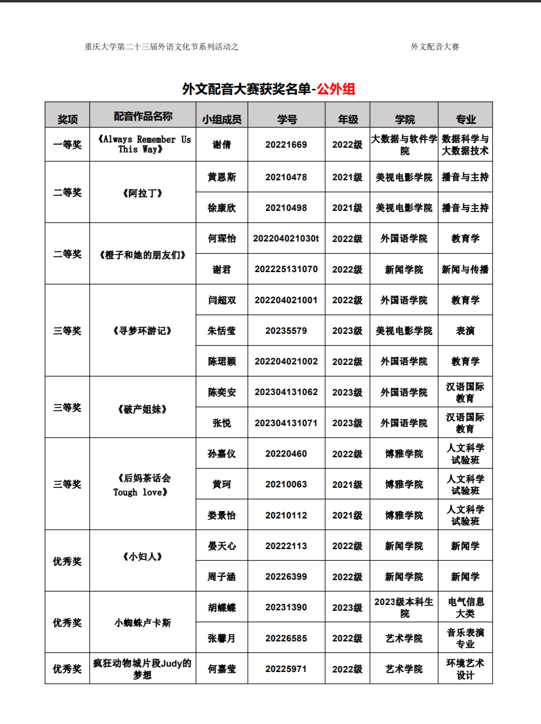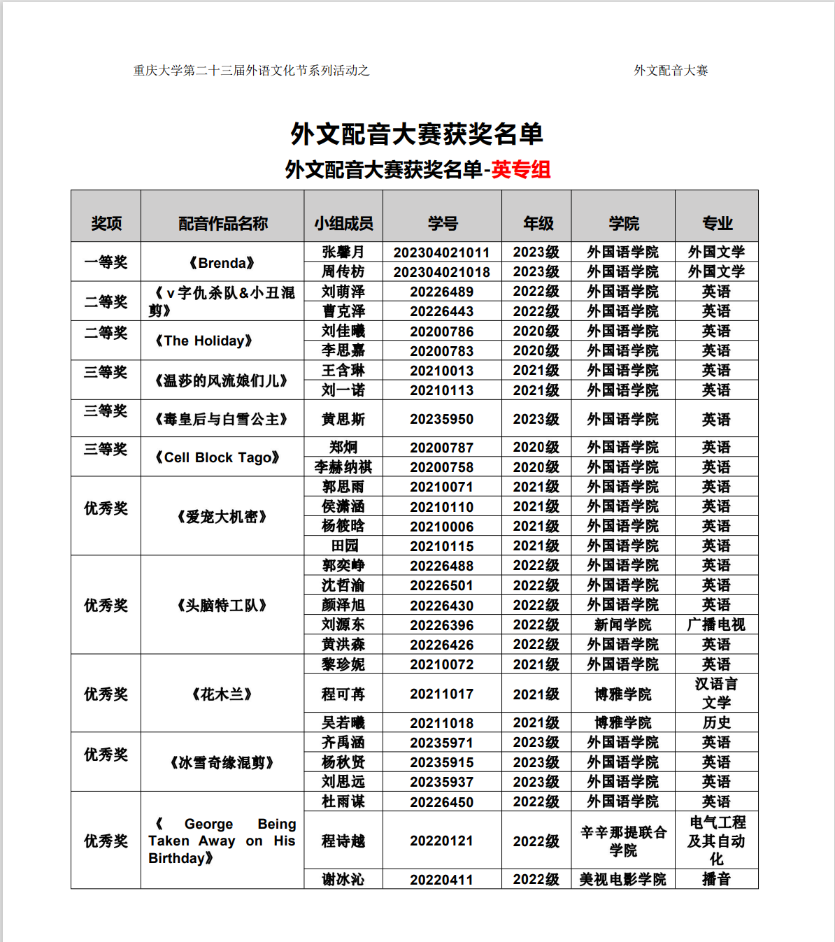 由18漫画 主办、18漫画 承办的18漫画 第二十三届外语文化节系列活动之外文配音大赛已经结束。赛事自11月18日启动以来,吸引到全校多支队伍前来参与,评选出31个获奖组。其中,英语专业组共11个获奖组29名获奖选手,公共外语组共9个获奖组18名获奖选手,日语德语组共10个获奖组29名获奖选手。 现将外文配音大赛获奖名单进行公布。
