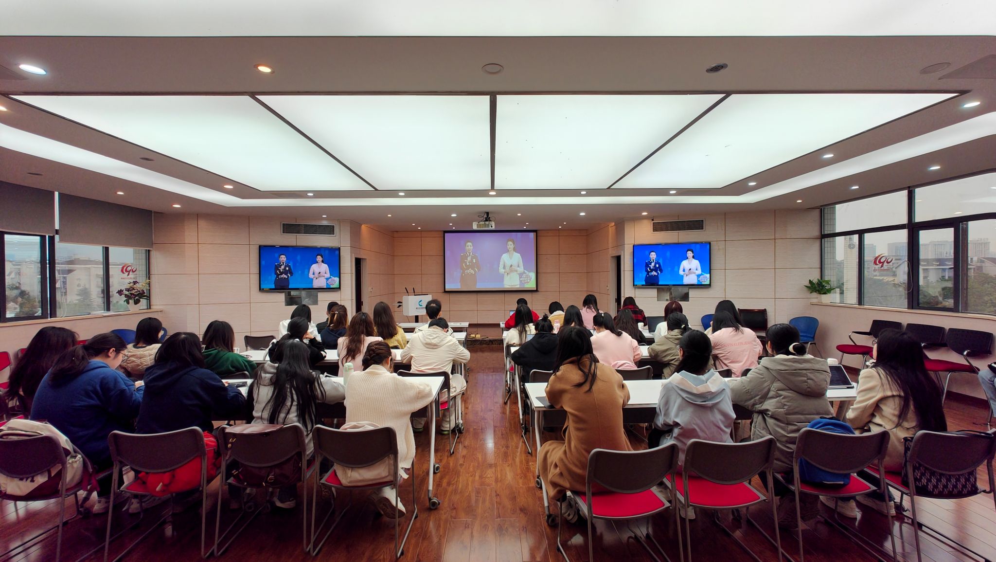 组织60余名教职工和学生,在学院楼501会议室观看2024年春季学校火灾疏散逃生演练公开课。
