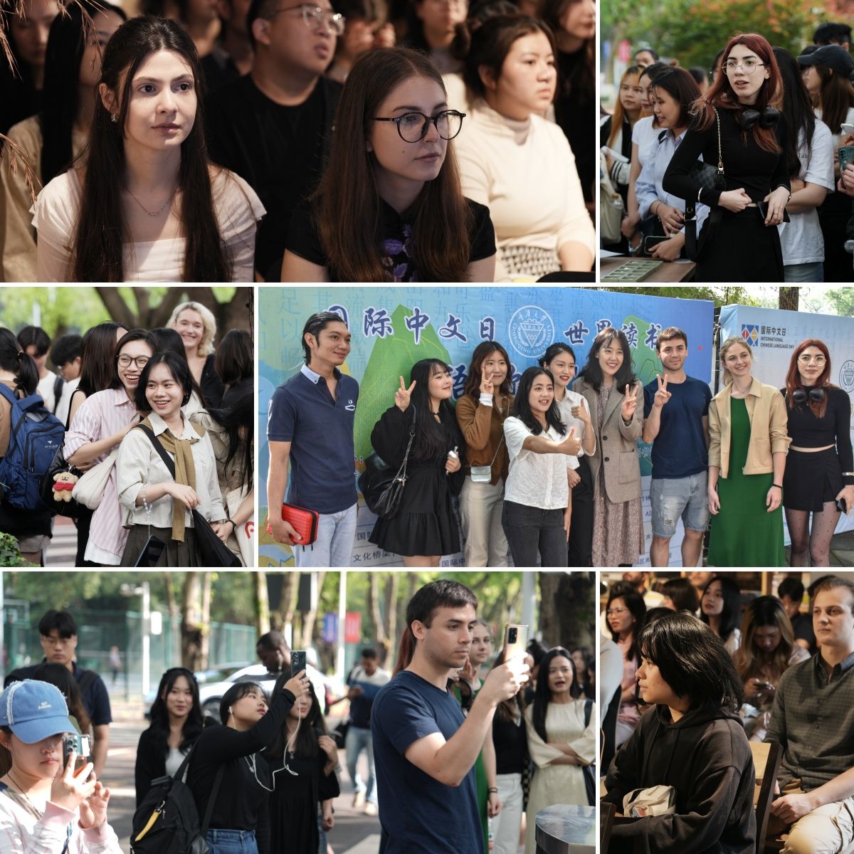 “国际中文日”——国际中文教育专业中外硕士生快闪活动,将现场氛围推向高潮,通过歌舞、朗诵、八段锦、剪纸、书法、簪花等形式展现了中外师生对中华文化的热爱。一曲充满古风韵味的《洛春赋》开场街舞,赢得了在场师生的阵阵喝彩。舞者们身着传统汉服,随着动感的音乐节奏,瞬间将观众带入古典艺术的世界。接着,中国学生身着传统马面裙,留学生穿着各具特色的民族服装,集体演唱并诵读了《诗经·小雅·鹿鸣》一诗,“我有嘉宾,鼓瑟吹笙”,体现了中国古代的待客之道和礼乐文化,展示了中国文化的优雅魅力。随后,一首欢快活泼的歌曲《上春山》,唱出了欢快明亮的少年气息。伴随着悠扬的音乐,在场观众纷纷下场,跟同学们一起打起了八段锦,将这一古老的中国健身艺术淋漓尽致地展现在舞台上。