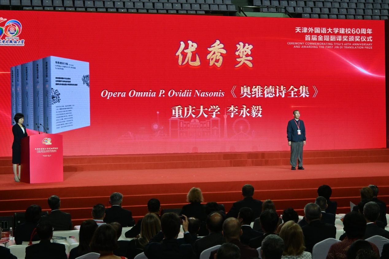 2024年9月28日,天津外国语大学建校60周年首届金隄翻译奖颁奖仪式在马场道校区体育馆隆重举行。天津市副市长张玲出席活动并讲话。葡萄牙驻华大使纳西门托,白俄罗斯驻华大使切尔维亚科夫,保加利亚驻华大使特霍夫,北马其顿驻华大使纳赛夫,天津市人大常务委员会副主任李虹,外交部原副部长、中国驻美国原大使周文重,天津市委原常委、市委教育工委原书记苟利军,中国驻沙特阿拉伯原大使李华新,联合国教科文组织代表团原大使衔代表、天外校友张秀琴等驻华使节、各级领导、国内外高校代表、社会各界嘉宾、海内外校友,以及学校历任老领导、全体现任领导、离退休教职工代表和师生代表2000余人参加颁奖仪式。天津外国语大学党委书记周红蕾主持颁奖仪式。