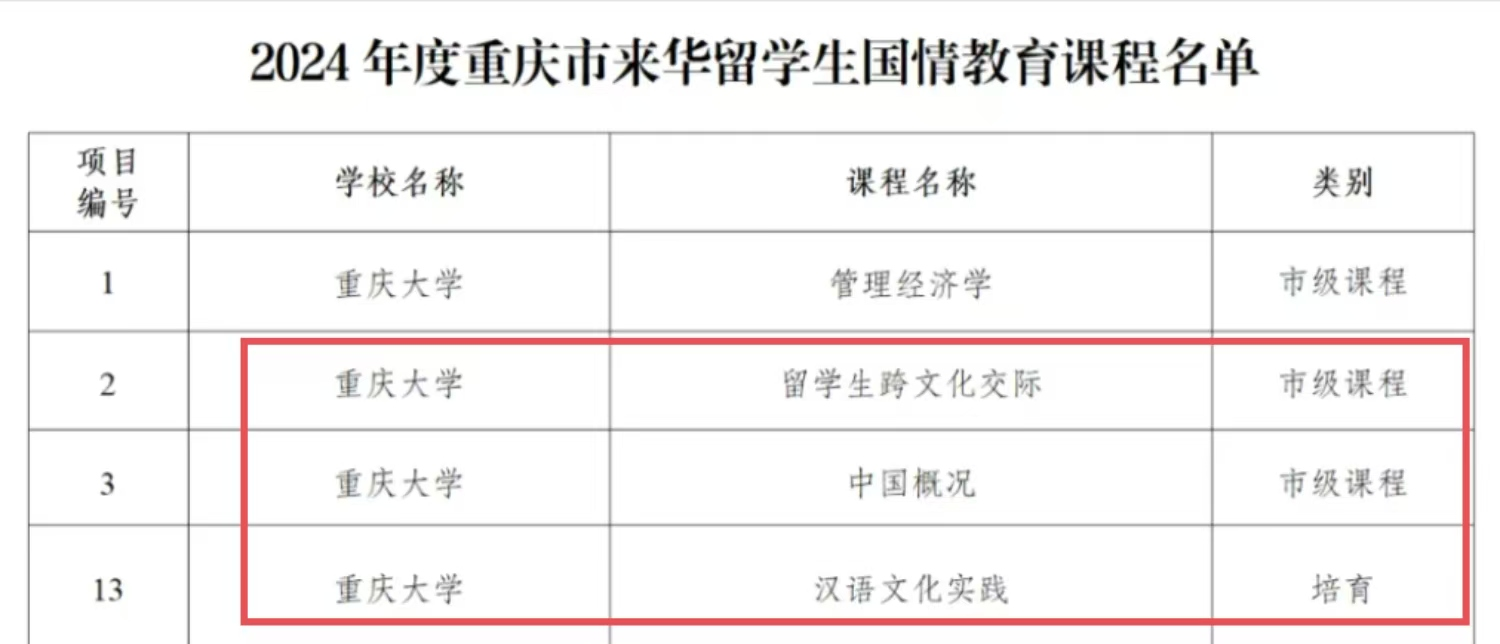 重庆市教育国际交流协会近日公布了2024年度重庆市来华留学生国情教育课程和来华留学生教育实践基地的评选认定名单,其中,本院国际中文教育系获批两个市级课程和一个培育课程。分别是:留学生跨文化交际(龙藜负责)、中国概况(姚倩负责)、汉语文化实践(李鑫负责)。