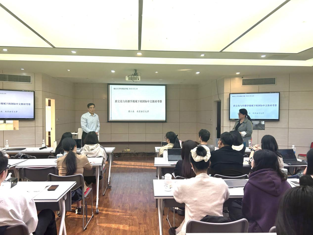 3月24日下午,周小兵教授以“跨文化与传播学视域下的国际中文教材设计”为题开展了第二场学术讲座。本次讲座由国教系龙藜副教授主持,现场座无虚席。讲座从宏观、中观、微观不同层面探讨文化交流互鉴和国际中文教材编写原则与实效,结合传播学“5W+2H”模型,提出了教材亲和力法则。结合跨文化与教材编写使用的实例,讨论国际中文教材文化教学设计面临的挑战与发展方略。