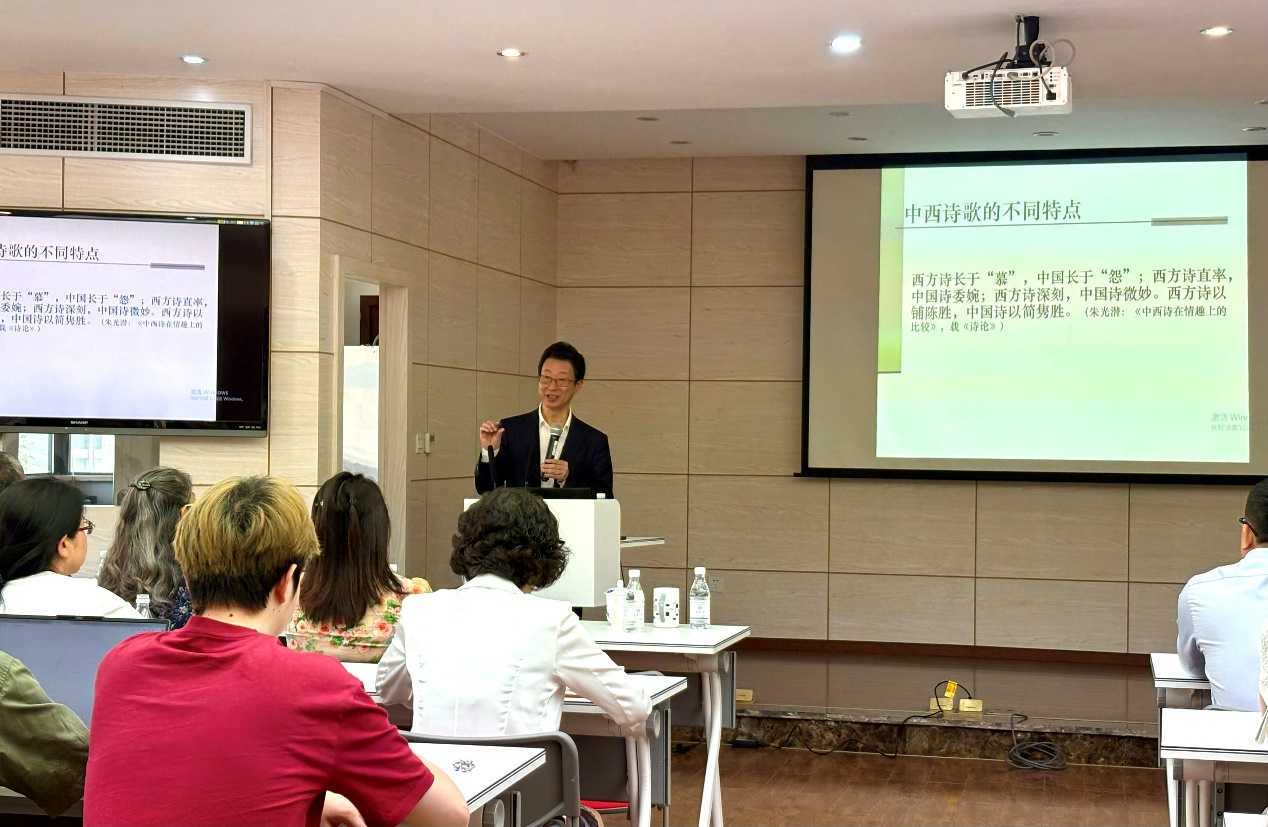 接着,查明建教授围绕“问题意识”与“问题意义意识”展开详细论述。他以朱光潜先生的《诗论》为例,从中西诗歌不同特点的比较分析出发,引用西方诗歌和中国古代爱情诗歌,说明中西诗歌在表达方式上的差异,进而引出朱光潜先生对中西诗歌特点的深刻见解。