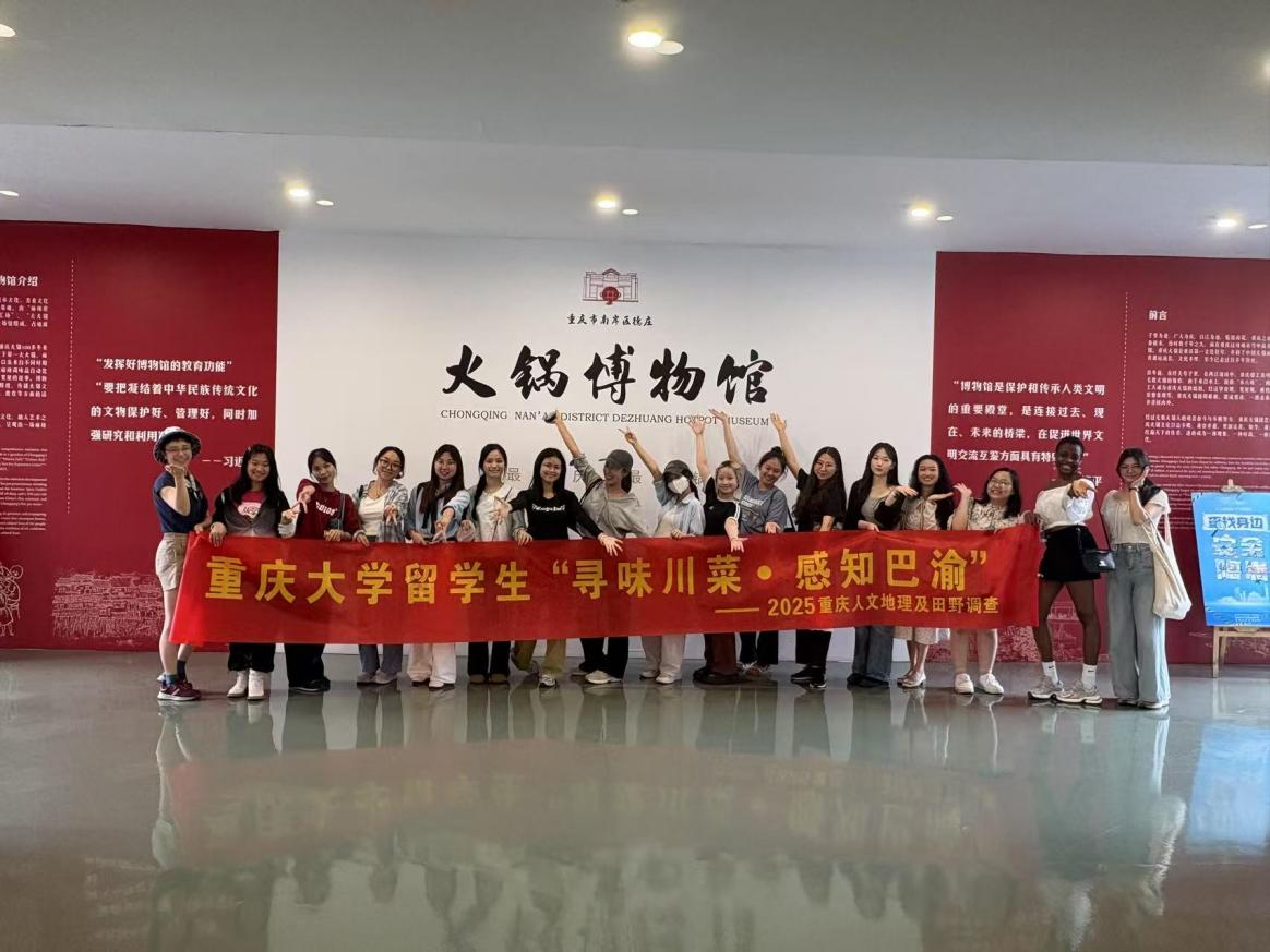 汉语国际教育本科专业学生在"重庆人文地理及田野调查"课程中,以"川菜非遗"为主题开展系列实践活动。该课程采用"课堂研讨+实地调研"的双轨教学模式,同学们在理论研讨的基础上,先后前往重庆德庄火锅博物馆和磁器口陈昌银麻花博物馆进行田野调查,通过实地探访与互动体验,感受非遗技艺的匠心传承,理解川菜文化背后的历史脉络与人文精神。