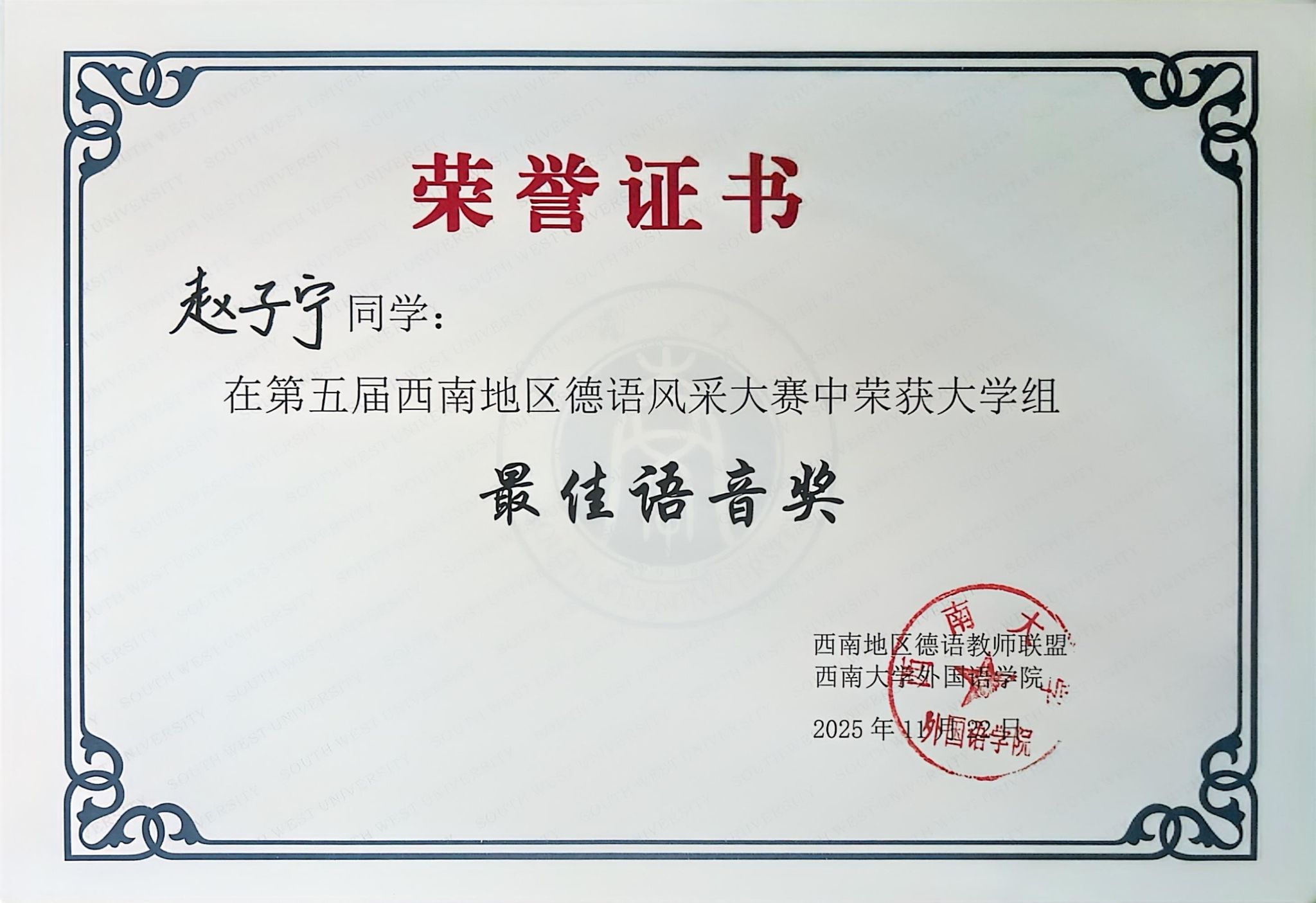 2023级德语专业本科生赵子宁、丁敏捷和李圆圆组成,在德语专业郭萌老师指导和带队下,以总分第一的成绩斩获大学组团体一等奖,赵子宁凭出色表现荣获“最佳语音奖”。