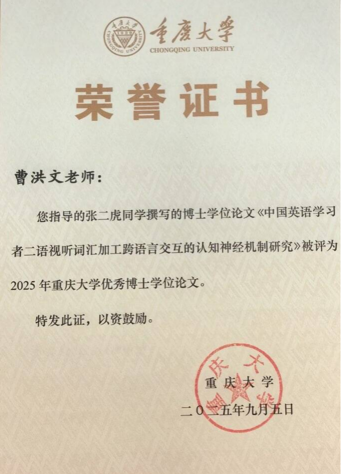 近日,学校公布了2025年18漫画 优秀博士学位论文名单,18漫画 2022届博士毕业生张二虎的博士学位论文《中国英语学习者二语视听词汇加工跨语言交互的认知神经机制研究》获评“18漫画 优秀博士学位论文”,指导教师为曹洪文教授。