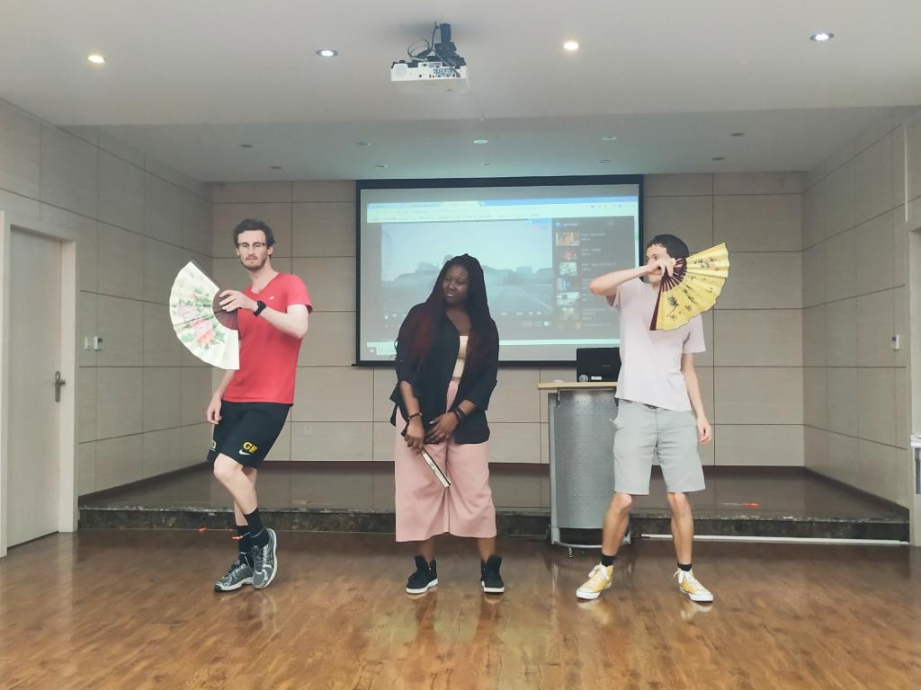 ,生动形象的讲解给英方友人留下了良好的印象。在中英歌曲接龙、你说我猜、欢乐踩气球等互动游戏中,双方学生相互协助、增进了解,氛围十分活跃。期间,蔡嘉轩带来的歌曲My Love、Patrick的《康定情歌》、James的中国风街舞、George、James、Vanessa三人的原创扇子舞、Ahmad的独白表演《雷雨》等才艺展示将联谊会气氛推向高潮。在自由交流环节,同学们还就语言学习心得、大学生活、近期游学感悟等主题进行了分享。