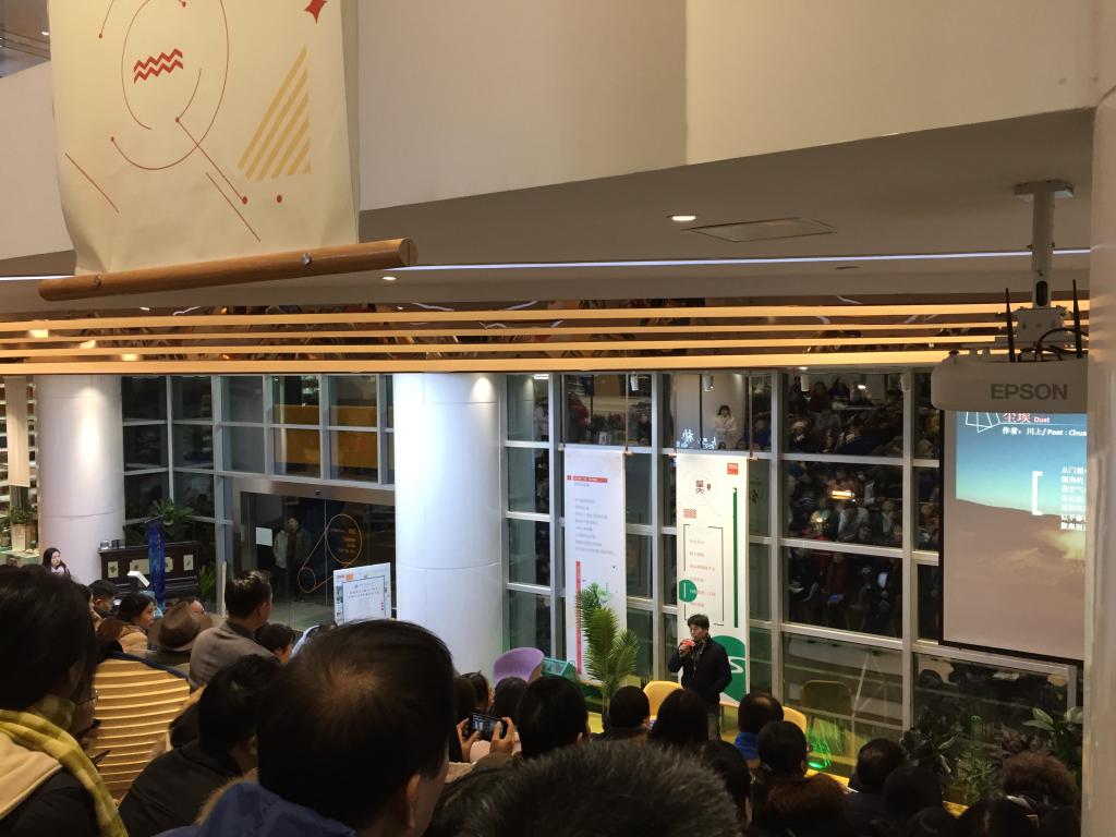 晚上“光阴十年:中外诗歌朗诵会”在利群书社举行,30多位中外诗歌爱好者朗诵了题材多样风格各异的诗歌,表现了诗歌语言的声音美、韵律美、意象美、哲思美、情感美、以及实验性诗歌的奇异。