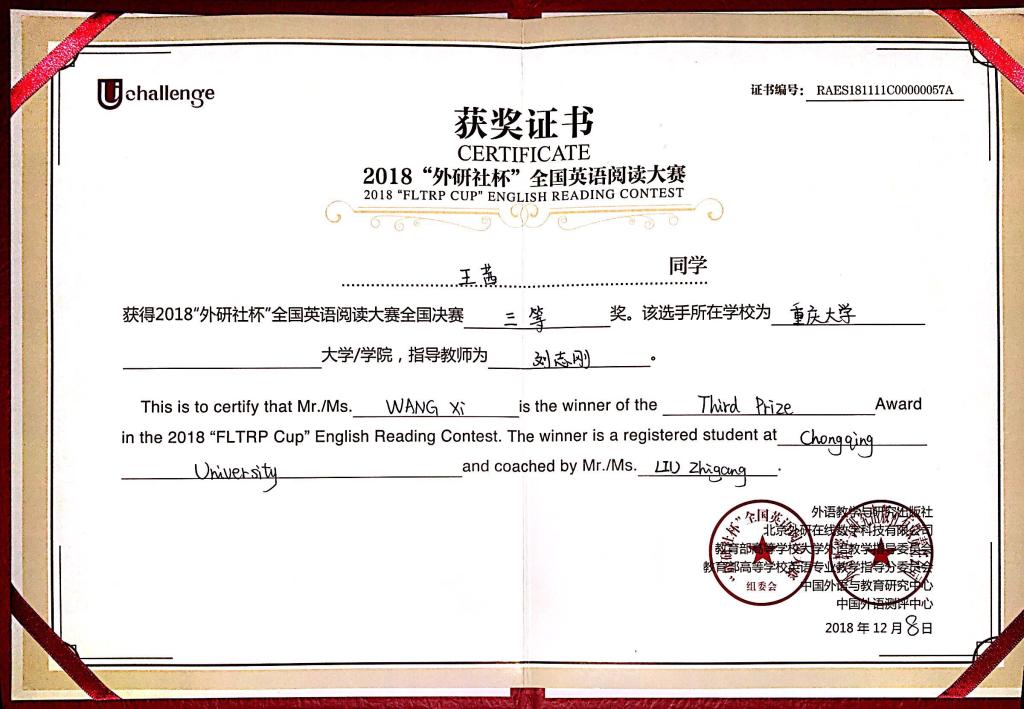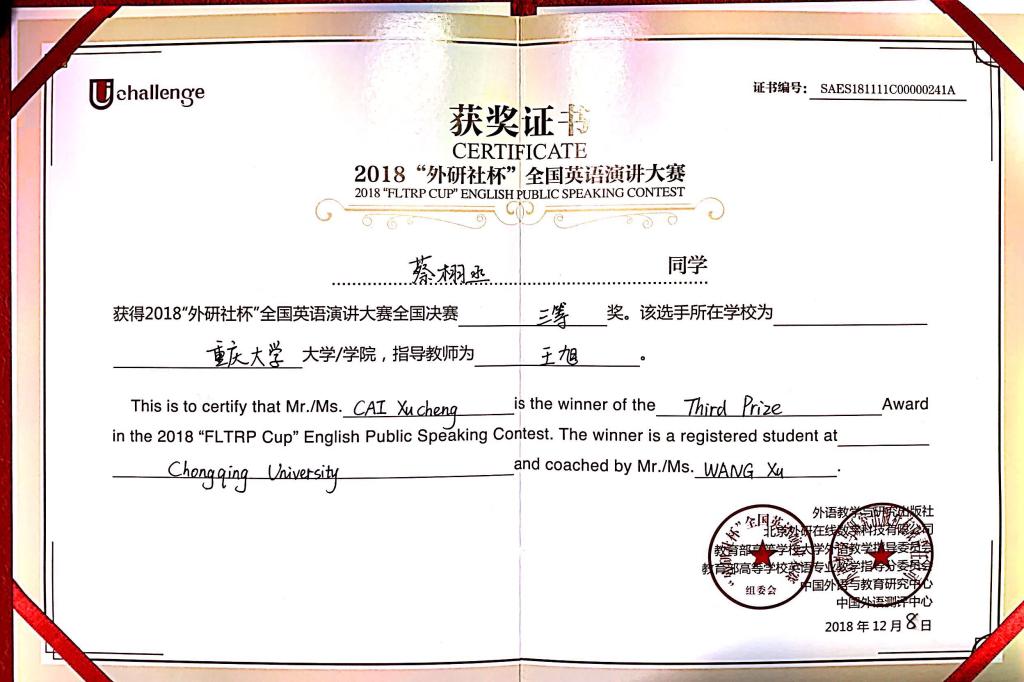 学生在本次全国大赛中取得的优秀成绩展现了重大学子独特的风采。至此,2018“外研社·国才杯”全国英语大赛完美落幕,期待重大师生不忘初心、砥砺前行,在下一届比赛中再接再厉。