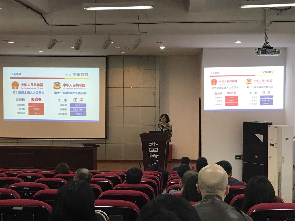 党委书记欧玲在外语学院楼二楼多功能厅给全院教职工上了一堂以“深入学习2018年全国两会精神”为主题的党课。