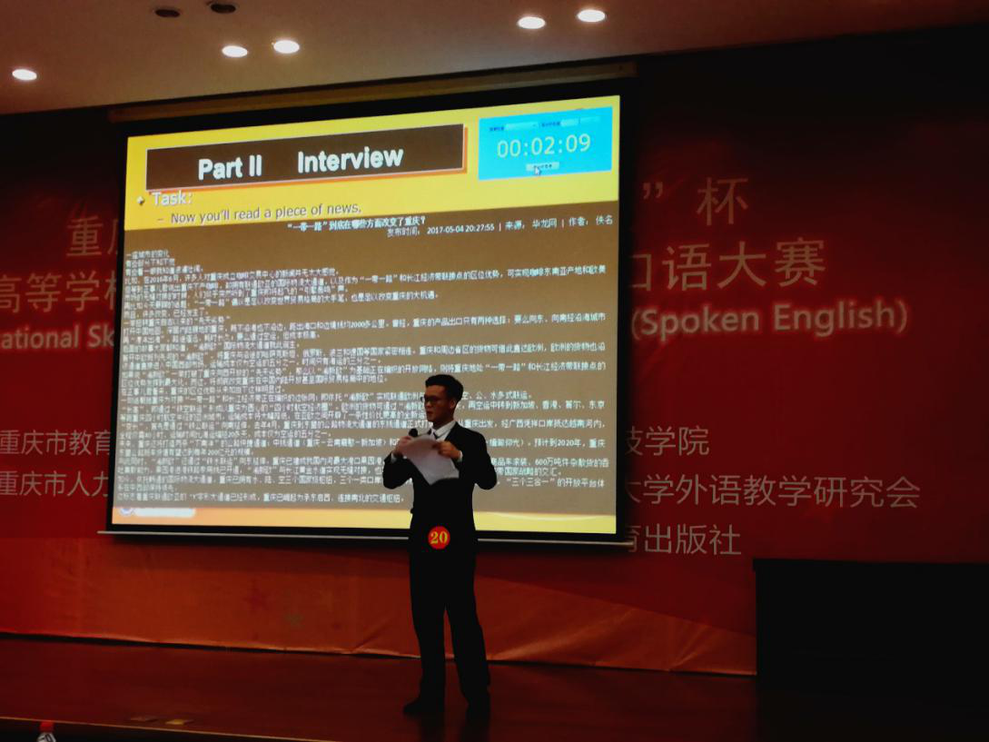 2018年3月31日,第十一届“巴渝工匠”杯重庆市高等学校学生职业技能竞赛英语口语大赛于重庆科技学院圆满落幕。这场比赛旨在继续深化重庆市高等学校英语课程教学改革,进一步展现和提高学生英语口语表达能力,激发广大高等学校学生学习英语的积极性,推进高校人才培养模式改革。