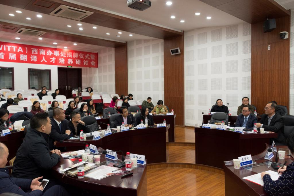 揭牌仪式结束后,四川外国语大学首届翻译人才培养研讨会正式开始。传神语联网络科技股份有限公司副总裁傅强,上海佑译信息科技有限公司执行副总裁王志涛,北京语智云帆科技有限公司执行总裁邹剑宇,上海世语翻译有限公司总经理曹斌,河南华译教育咨询有限公司总经理王孟飞等各位专家出席研讨会,并分别做主旨发言,就国际翻译人才培养新趋势、一带一路背景下复语翻译人才培养、口笔译教学模式创新与翻译人才培养、翻译技术发展、翻译课程设置、对外话语体系创新等子议题展开交流。