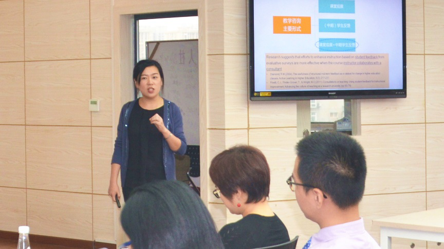 “中期学生反馈”咨询服务的开展情况。教师发展中心在开展实施课堂观察和学生反馈咨询服务的同时也对这项咨询服务进行了评估和反馈。数据显示,课堂观察和学生反馈可以鼓励教师清楚表达教学目标,促进教师对课堂教学反思,协助教师发现和解决教学问题……,是比较有效的教学咨询手段。随后,陈圆博士详细介绍了课堂观察和学生反馈实施的主要流程,并重点讲述了数据收集的实施过程,包括课堂观察记录的指标, 收集学生反馈以及形成反馈报告的注意事项。陈圆博士还组织了“课堂观察”指标重要成都问卷调查,与参会教师深入讨论了课堂观察指标的重要性,以期形成更加科学客观的“课堂观察”指标。