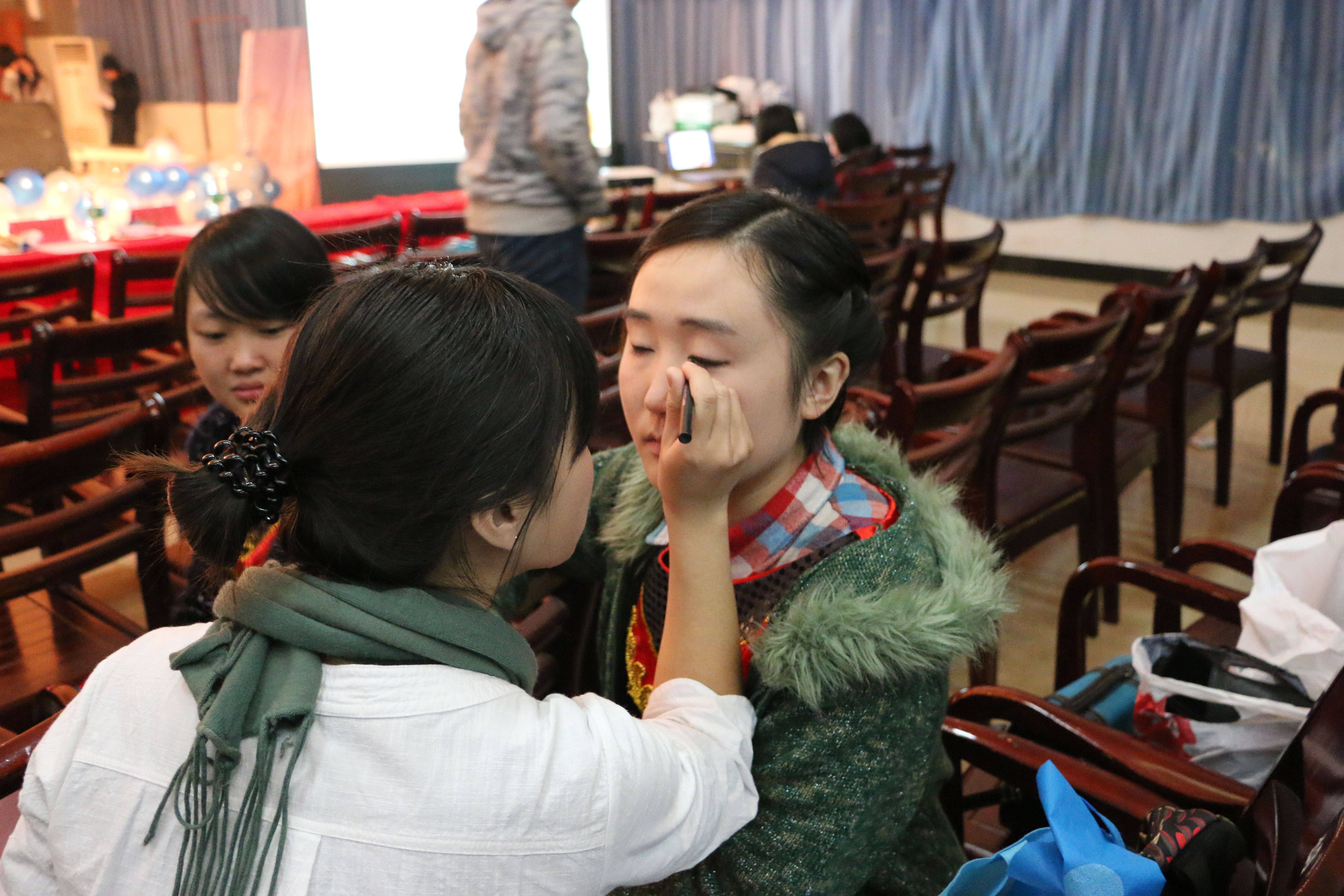当记者推开一食堂四楼多功能厅的大门时,一股热气扑面涌来。导演正在为演员们讲戏,一边讲一边用肢体语言夸张地比划着;演员正在为登台时最完美的一次亮相默默背诵台本,在舞台下紧张地来回走动;后勤道具组正在清点所有的道具,并及时为演员们上妆、补妆。而镁光灯正在一旁,默默为这个舞台增加热度。此刻的时间是: 18点整。离戏剧大赛的大幕拉开只有短短40分钟的时间了。