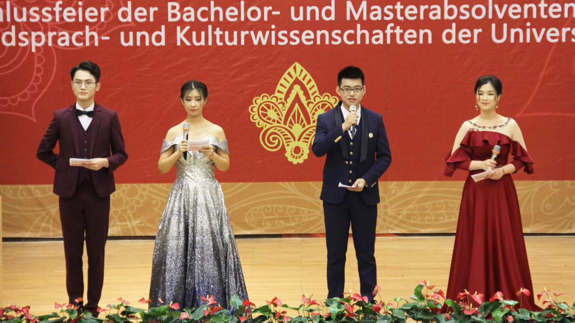 2018届本科毕业生和毕业研究生制作的满载回忆的毕业电子相册将师生的思绪拉回曾经最美好的时光。日语专业本科毕业生们以一曲时装舞蹈秀—东京盆舞开启了典礼。美丽的日式和服和富有节奏感的配乐,一下子将大家从离别的愁绪中抽离出来。大家纷纷随着日语系小姐姐们一起“摇摆”。英语3班的毕业生们以合唱的形式为大家带来两首歌舞串烧《房间》和《仰望星空》。在悦耳灵动的歌声中,毕业生纷纷畅想自己的未来。英语1班周宇翔和德语1班吴鹏宇演唱的《李白》将典礼的氛围推向高潮。