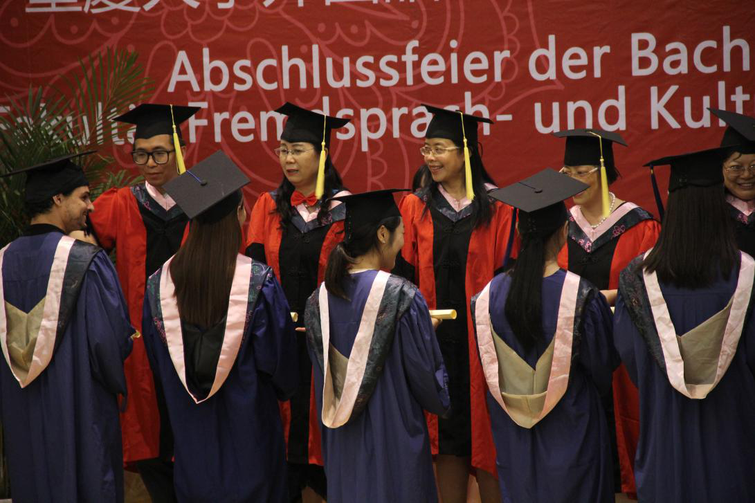 走下舞台后,大家纷纷和自己的同学、老师以及朋友一起照相,记录下这一珍贵时刻。典礼即将结束之际,2014级德语专业的罗冰雁同学以一曲《送别》为典礼拉下帷幕。主持人掷地有声的那句常回家看看,将定格在每个毕业生的心中,成为永恒的记忆。