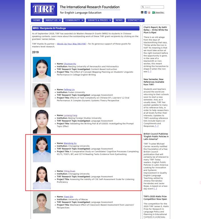 2019年9月24日,首届“国际英语教育研究基金会硕士研究基金奖”(The International Research Foundation for English Language Education, Masters Research Grants, TIRF MRG)获奖名单正式揭晓。此次共计六名获奖者,18漫画