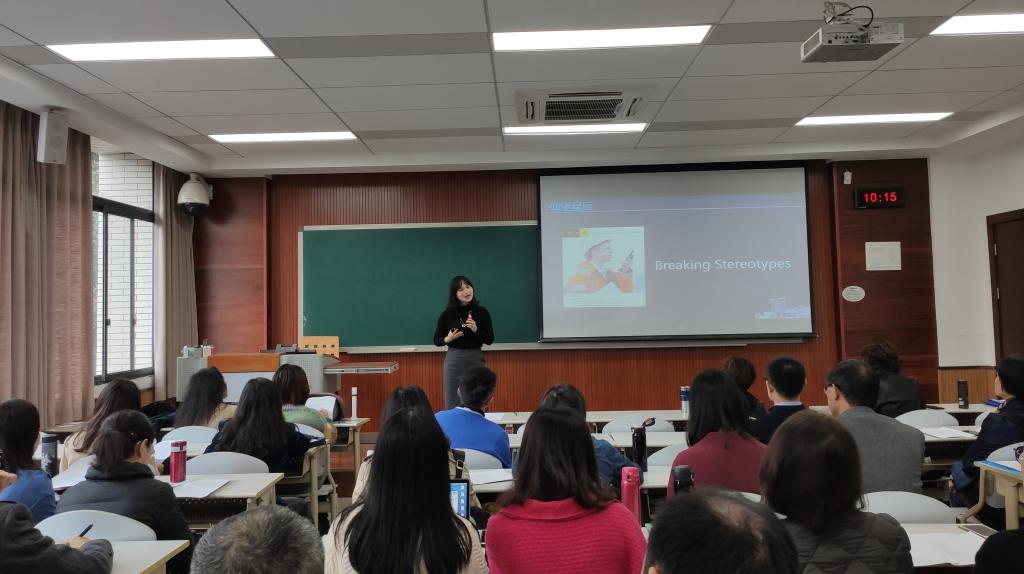 熊菲老师首先简要介绍了参加此次教学竞赛的准备过程和团队支持情况,以及决赛题目的内容和自己对题目的理解。随后,熊菲老师从“仰望星空”与“实踏土地”两个角度向与会教师展示了新时期外语教学的价值追求、教学活动的具体开展和学生外语水平发展特征。“仰望星空”指英语教育的育人理念。熊菲老师以自己在决赛中呈现“打破刻板印象”为主题的教学为例,阐述了“不拘泥于语言知识教学,促进思维能力与文化意识的发展”的育人目标。“实踏土地”则指英文老师应不忘自己“语言老师”的身份,需引导学生感悟字里行间的意蕴,体会遣词造句的美好。基于此,熊菲老师以综合教程中一个单元的教学为例,分享如何组织学生通过图画,转述,进行词义辨析、情感理解和修辞分析,在呈现文意的过程中实现语言知识与能力的提升。