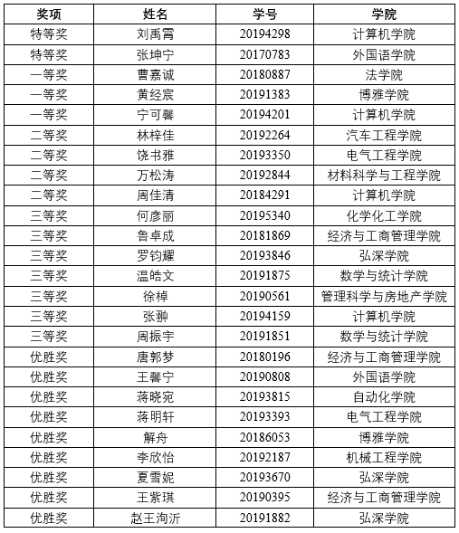 的王馨宁同学荣获校级特等奖,来自博雅学院的解舟和生物工程学院的宋晨阳等同学荣获校级一等奖。