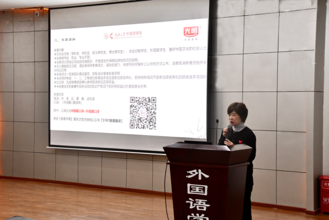 盛荔老师进行了开场宣讲。她回顾了历届“儒易杯”中华文化国际翻译大赛的历史,告诉同学们参赛须知的同时进行了一些赛程指导,她特别提到比赛的含金量与对同学们语言能力的训练作用,鼓励同学们积极报名参赛。