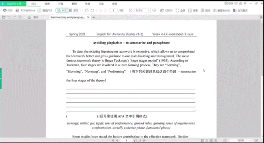熊菲老师以Teamwork单元为例,把语言学习和学期项目进行有机的融合,加强了学生对概要(summary)和转述(paraphrasing)两项写作技能的掌握,以培养学生的学术诚信,同时强调项目实践中团队协作的重要性。