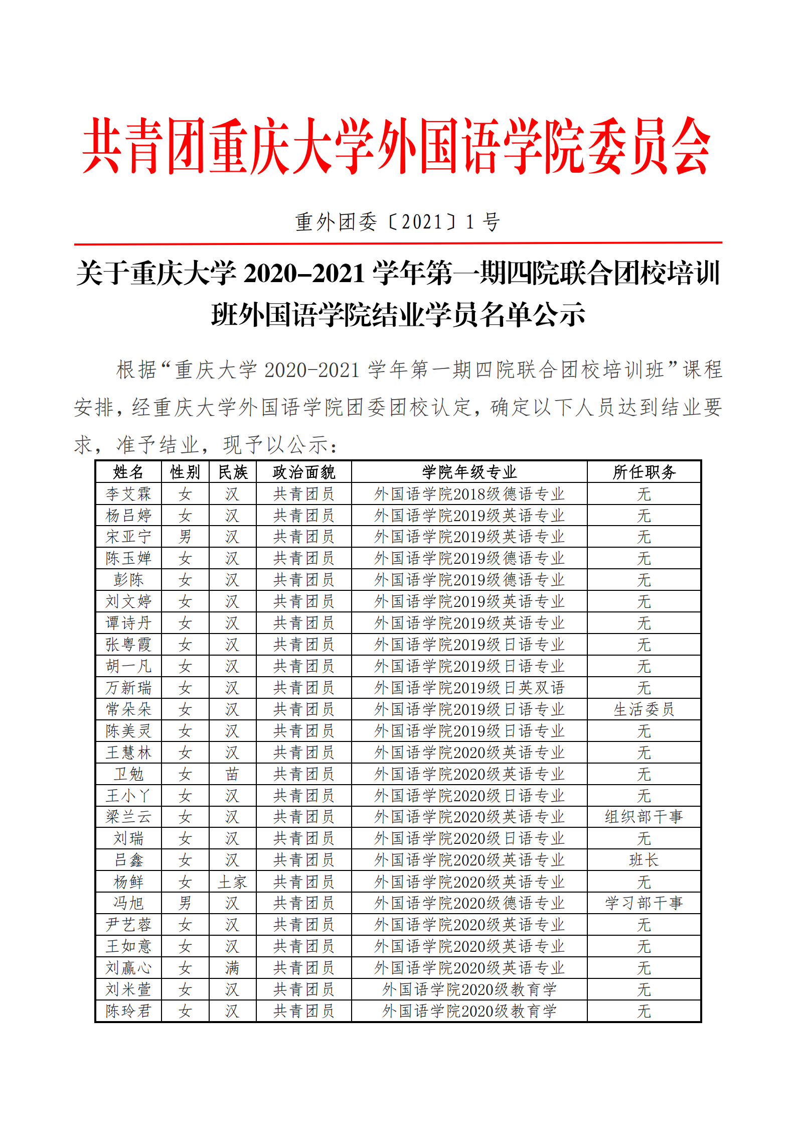 关于18漫画 2020-2021学年第一期四院联合团校培训班*18漫画 结业学员名单公示(重外团委〔2021〕1号)(1)(1).pdf
