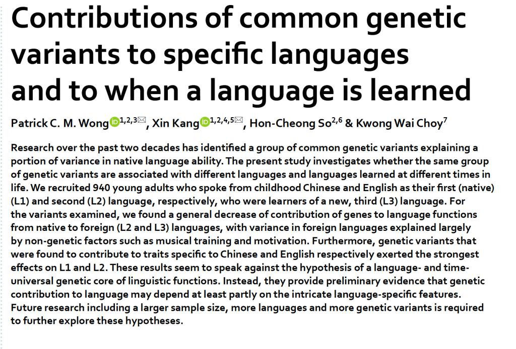 过去二十多年,生命科学尤其是分子遗传学的研究发现语言能力的个体差异的有一定的基因基础,特定的基因(例如FOXP2)与言语障碍相关。然而,此前的研究通常以英语为母语的人群为研究对象,并且少有研究关注第二语言或者外语学习成效的个体差异。由于世界上有7000多种语言,说这些语言的人群本身也存在重要的基因差异,以英语为母语的人群的研究结果难以应用到其他语言的学习者,尤其是二语学习者。