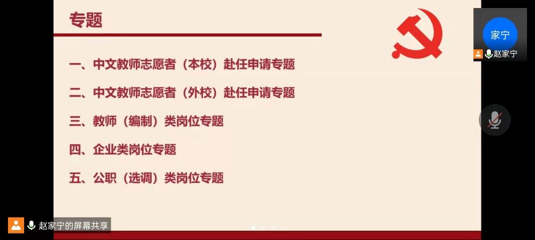 此次分享会充分联系专业学生对即将开始的2022年国际中文教师志愿者申请的困惑,以及在未来就业中面临的困境,分为五个专题展开:国际中文教师志愿者(本校)申请赴任专题、国际中文教师志愿者(外校)申请赴任专题、教师类岗位专题、企业类岗位专题、公职类岗位专题。