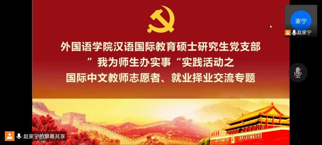 汉语国际教育硕士研究生党支部通过腾讯会议召开了择业、就业和国外志愿者录取经验分享会。作为汉硕党支部“我为师生办实事”主题系列实践活动之一,本次专题交流选择了同学们急于了解和感兴趣的话题,希望能帮助大家了解相关就业信息、理清就业思路。此次分享会由汉硕党支部副书记赵家宁同志主持,支部2020级党员作经验分享,汉语国际教育专业2021级全体学生参加了交流