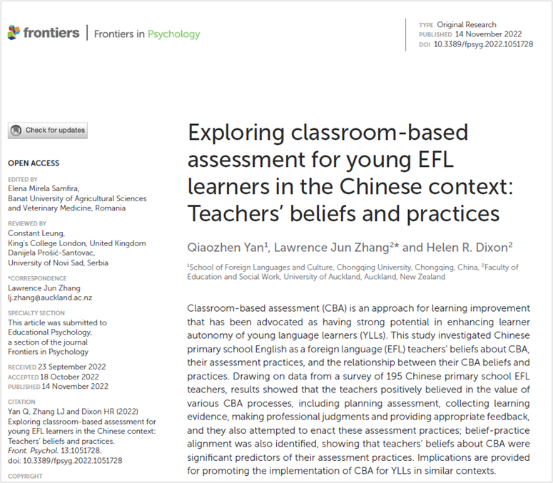 英语系讲师颜巧珍博士与新西兰奥克兰大学Lawrence Jun Zhang和Helen Dixon教授合作,在国际知名期刊Frontiers in Psychology(SSCI一区)发表学术论文Exploring classroom-based assessment for young EFL learners in the Chinese context: Teachers’ beliefs and practices。该论文是中央高校基本科研业务费项目(《中国英语能力等级量表》在义务教育阶段英语促学评价中的应用研究)(项目编号:2022CDJSKJC03)的成果之一。