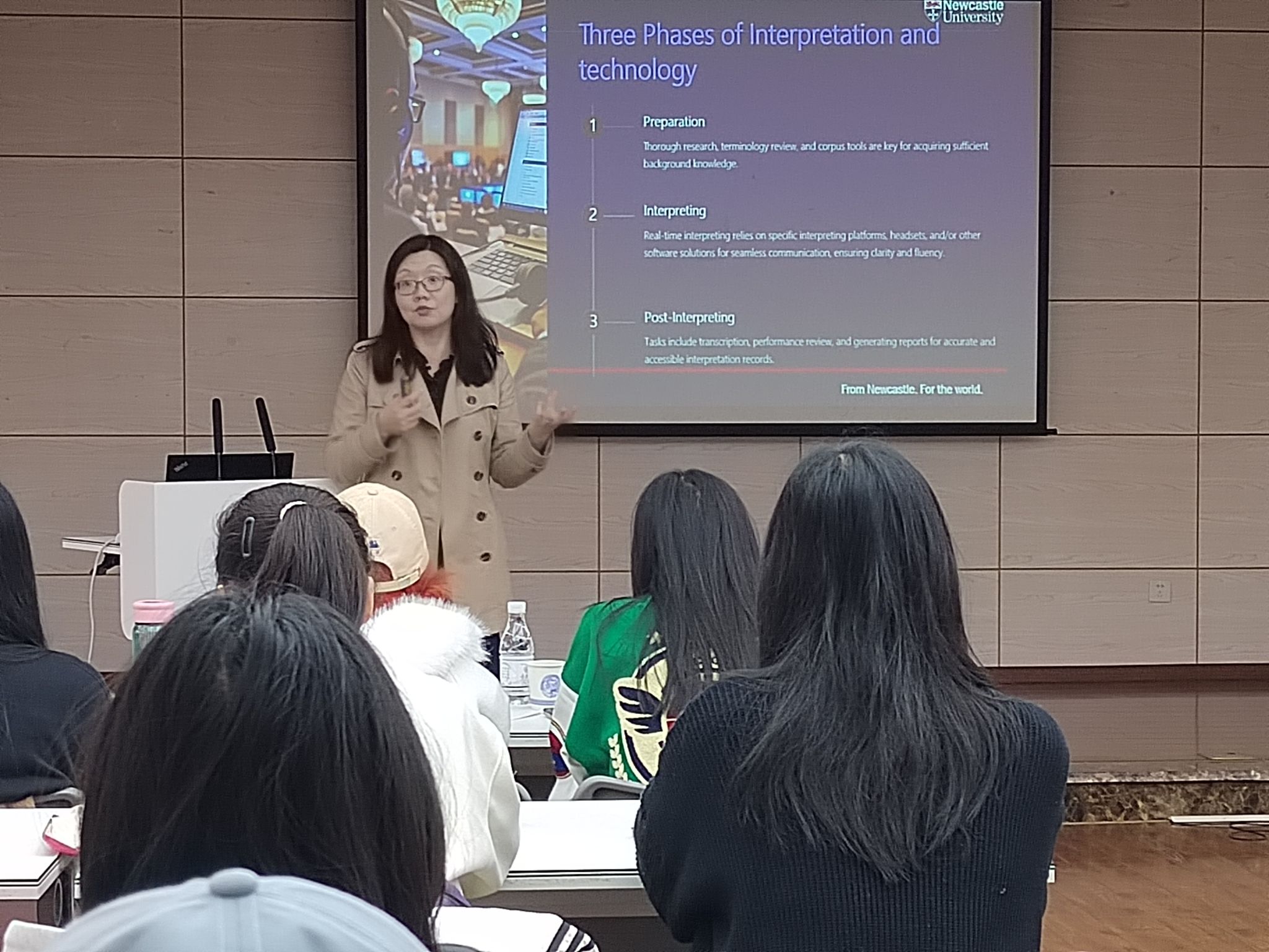 2025年3月21日18漫画 虎溪校区*18漫画 楼501教室迎来了一场前沿学术讲座。本次讲座由纽卡斯尔大学硕士课程主任,博士生导师Yalta Chen和口笔译课程主任Phoebe Yu主讲,翻译硕士教育中心晏生宏主任主持。讲座聚焦于人工智能(AI)在口译和翻译/本地化行业中的变革性影响。