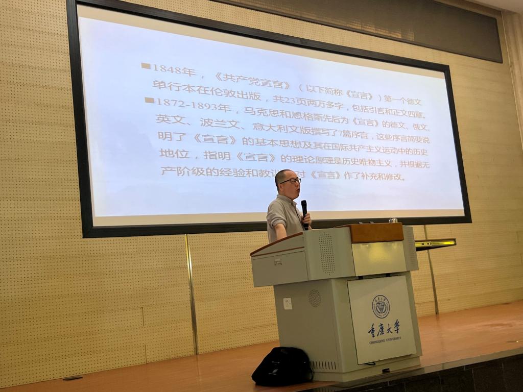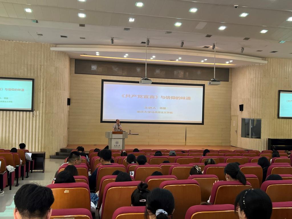 蒋楼老师以《〈共产党宣言〉与信仰的味道》为题,从《共产党宣言》的诞生历史切入,详细地阐述了《共产党宣言》对于工人阶级的指导作用,深刻说明共产主义的出场具有历史必然性。蒋楼老师从三个方面依次进行了介绍。一是《共产党宣言》的诞生。这部“工人阶级”的圣经,逐渐敲开了世界五大洲各个国家的大门,带来了先进的共产主义,拉开了革命的篇章,成为了无数人的伟大信仰。二是共产主义幽灵的出场。共产党人向一切旧势力宣告,共产主义是引领人们改变现实不公、追求幸福和谐生活的真正革命力量。三是资产者和无产者的斗争。面对脱节的资本主义时代,共产党人明白只有依赖自身,只有阶级斗争才能实现对资本主义社会的取代,才能使时代重新走向正轨,走向公平正义的光明未来。最后,蒋楼老师不忘告诫同学们共产党人的使命是实现每个人的自由发展,传递了对当代青年的殷切期望。
