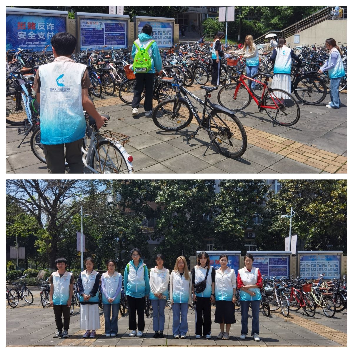 第二组的学员们在组长白露同学的带领下,于2024年4月26日中午在虎溪校区一食堂广场开展了整理停放自行车的志愿服务活动。大家齐心协力,不怕脏不怕累,将停放的自行车摆放得整整齐齐。大家选择了中午人流量最多的时候开展志愿服务活动,希望以实际行动激发和带动同学们都整齐停放自行车。