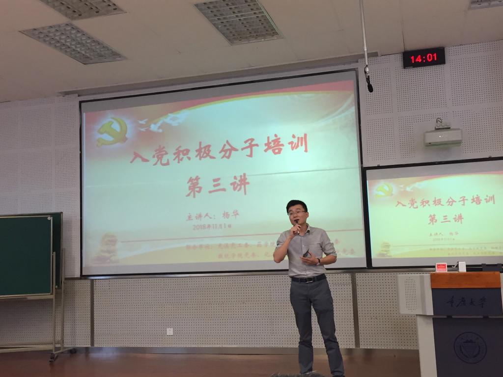 党委、虎溪校区党工委、药学院党委、数统学院党委、化工学院党委、物理学院党委联合党校组织的第37期入党积极分子培训第三讲在一教137教室进行。此次培训由药学院组织员曹全兴老师主持。