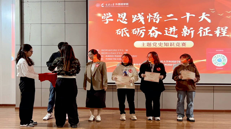 在工作人员进行现场计分环节时,全体同学一起欣赏经典红色歌曲、观看红色影视片段。最终,通过对二十名参赛选手的积分情况进行统计,评出本次知识竞赛的一等奖、二等奖、三等奖和优秀奖。2023级研究生团支部书记胡稀雨为获奖选手颁奖。