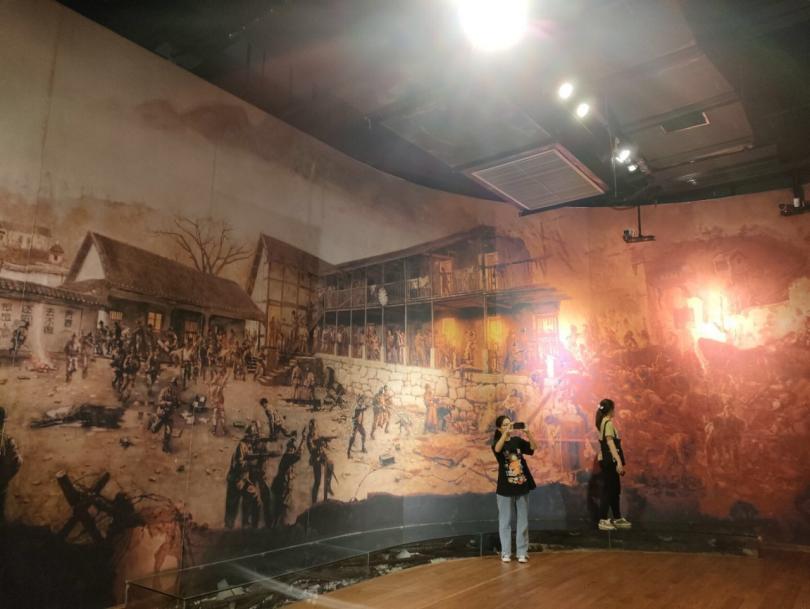 在所有展区中,最令实践团成员们震撼之处,莫过于“11·27”大屠杀半景画馆了。此馆主要展出的是通过现代技术复原的“11·27”大屠杀现场壁画,在壁画底部还通过玻璃走廊展示了于大屠杀牺牲的先烈们的遗物和现场的残骸。走在此处,眼观壁画,每一步、每一眼都显得格外沉重。壁画无声,却庄严有力地向每一个游客诉说着那一段充满鲜血与泪水地岁月,警示着我们勿忘历史,负重前行。