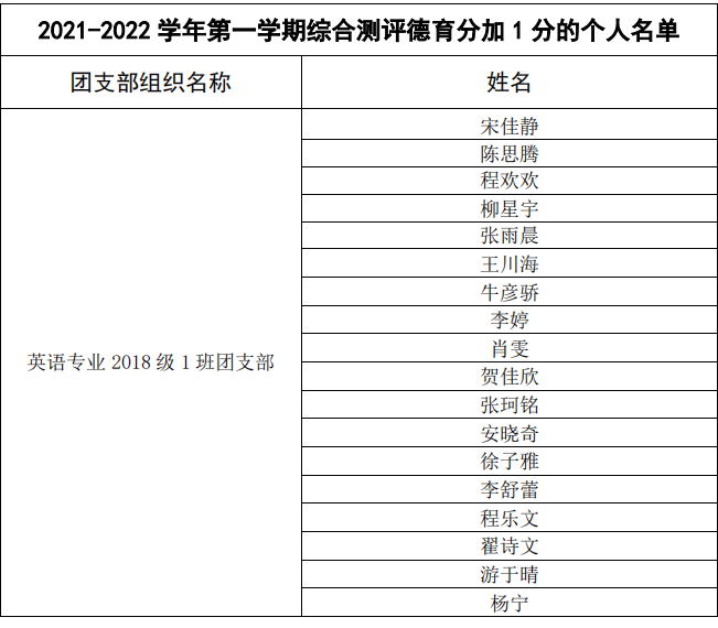 根据《*18漫画 团委团支部评级办法(试行稿)》文件要求,18漫画 开展 2020-2021 学年第二学期团支部、团员积分考核评级:“学期内有两个月“青年大学习”主题团课学习记录,综合测评德育分加1 分”。经*18漫画 团委组织部具体考核评定,报院团委审核批准,现将 2020-2021 学年第二学期综合测评德育分多加 1 分名单公示如下: