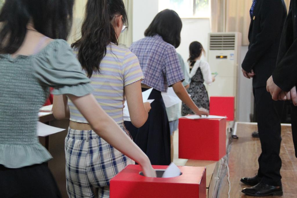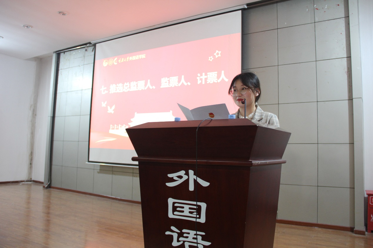 郭昕敏同学主持推选总监票人、监票人、计票人。大会现场举手表决通过提名总监票人1名(赵振宇)、监票人3名(刘骞、周文垚、邓沧怀)、计票人3名(刘佳曦、钱泽婷、于宗驹)。