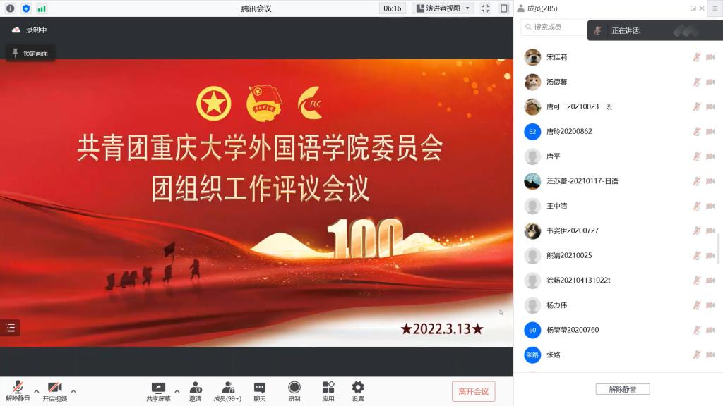 2022年3月13日下午2时30分,为贯彻落实习近平总书记关于青年工作的重要思想、严格执行“从严治团”要求、进一步完善“工作好不好,青年说了算”的评价机制,18漫画 根据团市委文件精神及校团委通知要求,召开*18漫画 团委团组织工作评议会议。由于近期疫情防控形势严峻,为保障18漫画 师生的身体健康安全,本次会议以腾讯会议的方式于线上开展。