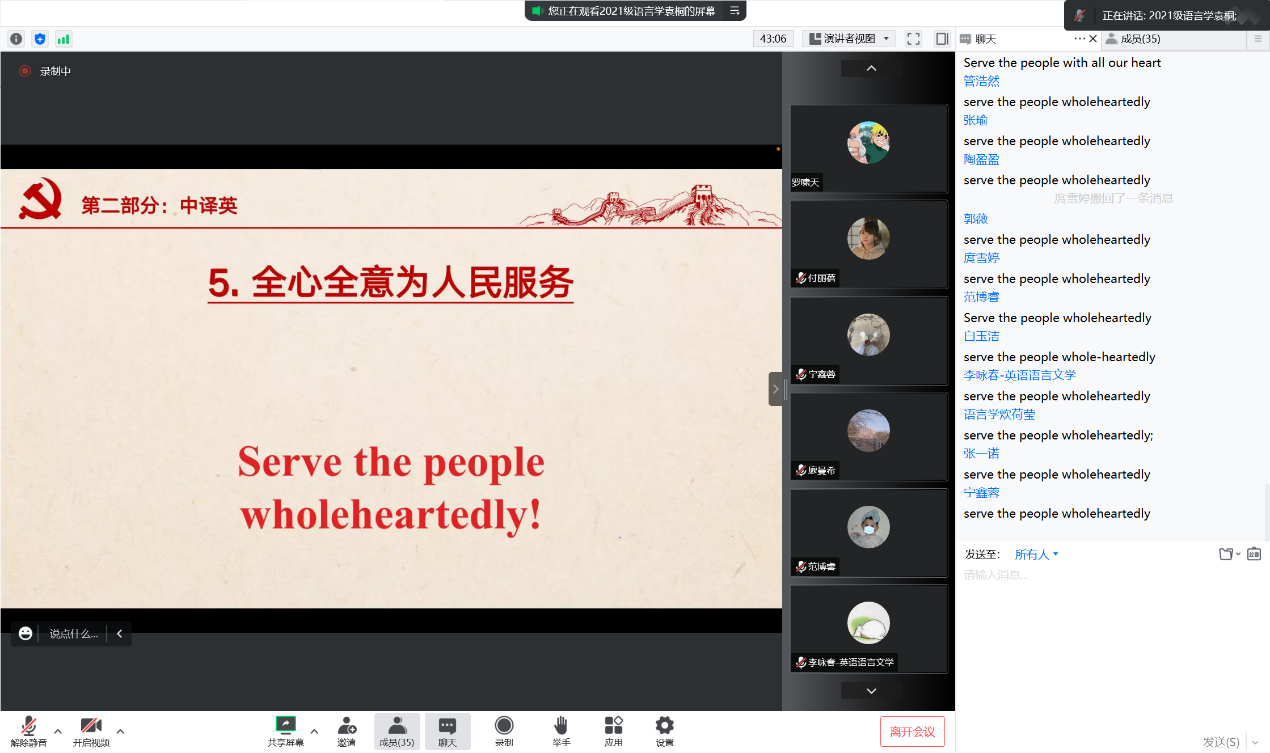 学子的别样风采。在诗词填空环节,各位选手你追我赶、毫不相让的样子仿佛在向世人宣告外院学子并不只专精于外语,在诗词方面也是一把好手。而最后一个环节的观看视频填空竞赛中,选手们毫不退缩,不停将自己的答案展现在聊天框中,将现场紧张激烈、精彩纷呈的气氛推向最高潮。