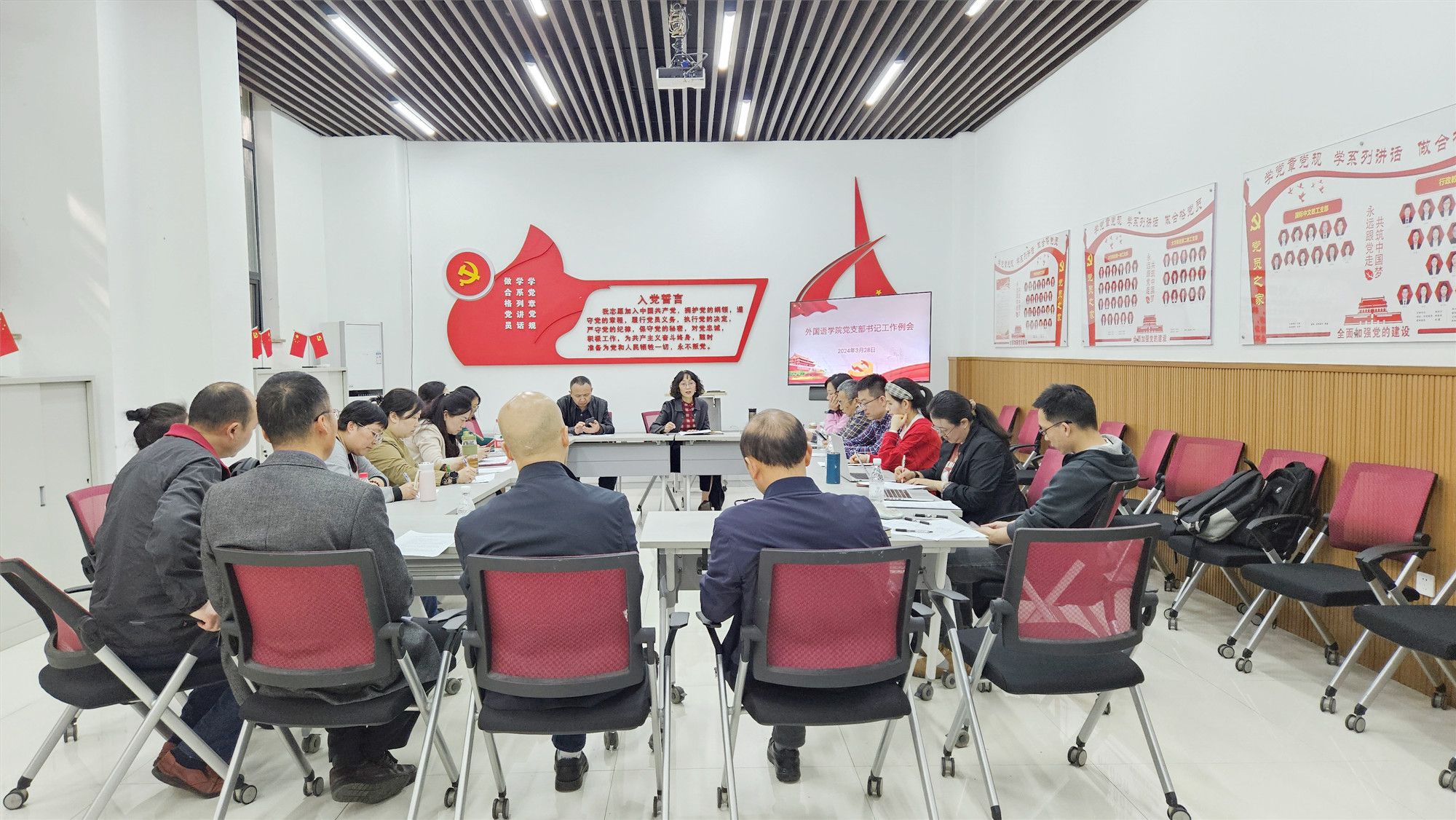 党委在外语学院楼105党员活动室召开了2024年第一次党支部书记工作例会。会议由学院党委书记欧玲主持,学院党委副书记魏世平,各教工党支部书记、支委委员,学生党支部书记(教师)参加了会议。