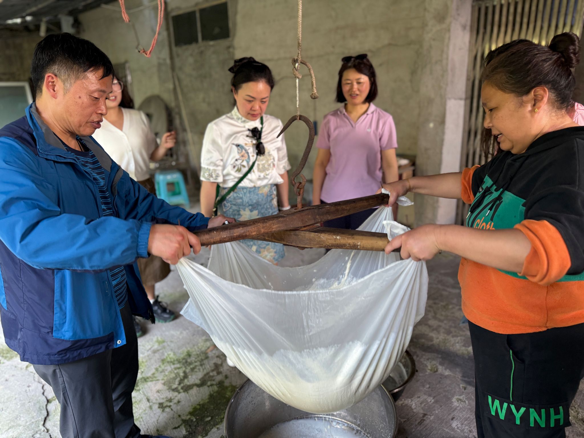 学习结束后,支部成员们来到运河村璧北河沿江步道调研、踏青,欣赏乡村的宁静与美好,体验了传统豆花从磨豆、过滤到煮浆、点卤的复杂工序,感受乡村饮食文化的独特魅力。