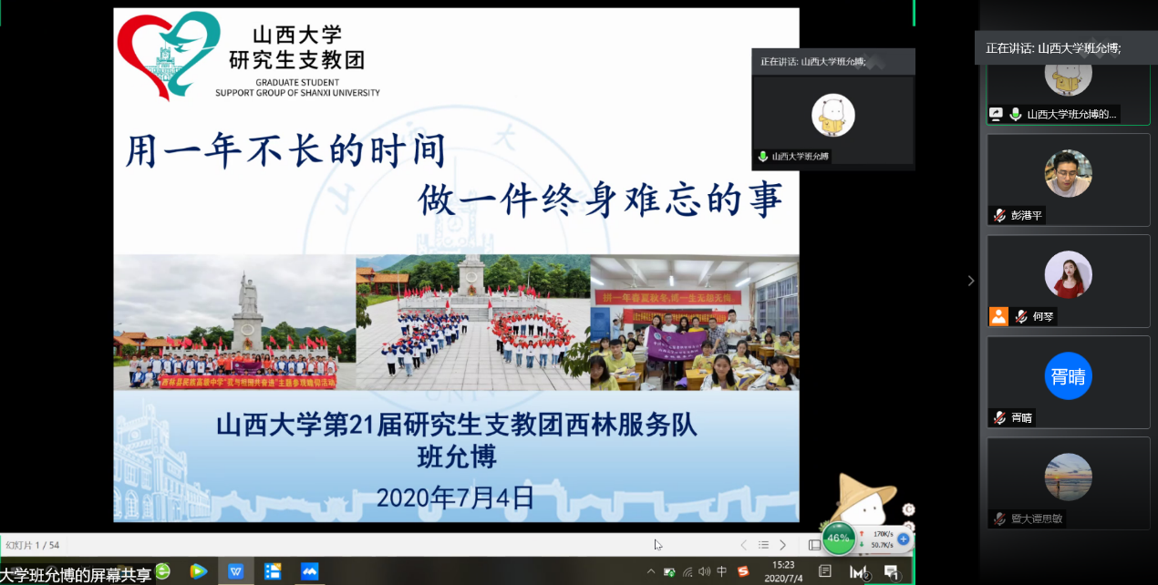 随后,陕西大学研究生支教团团长班允博同志分享了自己在广西为期一年的支教服务心得。班允博同志从支教服务的初心使命——支教扶贫、实践育人出发,谈到了自己以及整个支教团队在一年的支教服务期间的教学工作:以教学为本,创办七彩课堂,给孩子们带去丰富多彩的课外实践活动,并且从切实的教学工作中体会到了“台上一分钟,台下十年功”的艰辛,也体会到了“读书改变命运”对于贫困地区孩子们的分量。尤其是疫情当下,班允博同志及其志愿团队在在教育战线上勇敢“逆行”,为高三毕业班的学习提供学业保障。